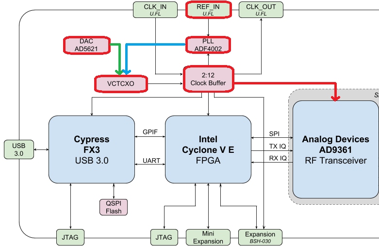 All direct-conversion SDRs (including all AD9361-based SDRs like the USRP B2X0, Analog Devices Pluto, and bladeRF) rely on a single oscillator to provide a stable clock for the RF transceiver. Any offsets or jitter in the frequency produced by this oscillator will translate to frequency offset and frequency jitter in the received or transmitted signal. This oscillator is onboard, but can optionally be âdisciplinedâ using a separate square or sine wave fed into the bladeRF through a U.FL connector on the board.