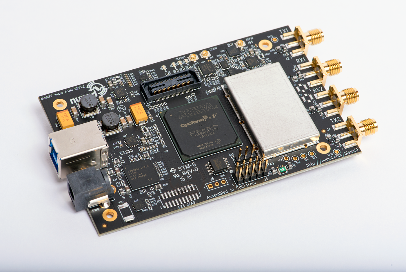 The bladeRF 2.0 (a.k.a. bladeRF 2.0 micro) from the company Nuand is a USB 3.0-based SDR with two receive channels, two transmit channels, a tunable range of 47 MHz to 6 GHz, and the ability to sample up to 61 MHz or as high as 122 MHz when hacked. It uses the AD9361 RF integrated circuit (RFIC) just like the USRP B210 and PlutoSDR, so RF performance will be similar. The bladeRF 2.0 was released in 2021, maintains a small form factor at 2.5â x 4.5â, and comes in two different FPGA sizes (xA4 and xA9). While this chapter focuses on the bladeRF 2.0, a lot of the code will also apply to the original bladeRF which came out in 2013.