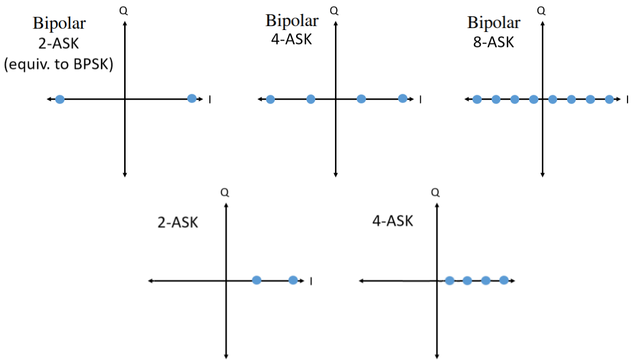 Letâs detour back to ASK for a moment. Note that we can show ASK on the IQ plot just like PSK. Here is the IQ plot of 2-ASK, 4-ASK, and 8-ASK, in the bipolar configuration, as well as 2-ASK and 4-ASK in the unipolar configuration. In this context, bipolar means the modulated signal can take on both positive and negative amplitude values, whereas unipolar ASK only uses positive amplitudes.