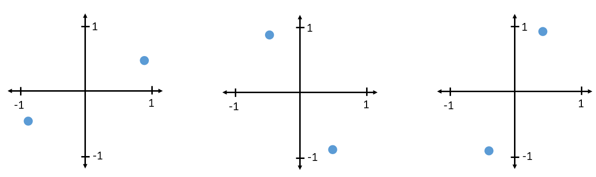 To receive and decode BPSK we can use IQ sampling, like we learned about last chapter, and examine where the points end up on the IQ plot. However, there will be a random phase rotation due to the wireless channel because the signal will have some random delay as it passes through the air between antennas. The random phase rotation can be reversed using various methods we will learn about later. Here is an example of a few different ways that BPSK signal might show up at the receiver (this does not include noise):