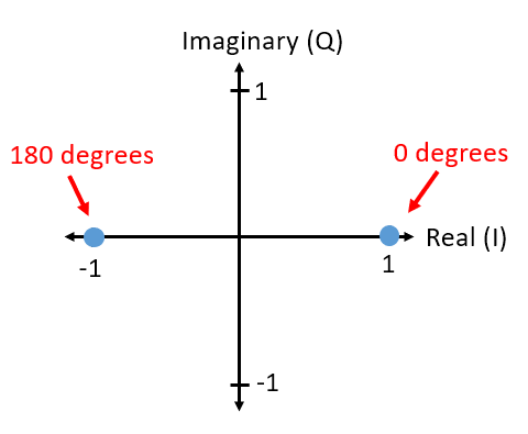 You have seen IQ plots before in the complex numbers subsection of the IQ Sampling chapter, but now we will use them in a new and fun way. For a given symbol, we can show the amplitude and phase on an IQ plot. For the BPSK example we said we had phases of 0 and 180 degrees. Letâs plot those two points on the IQ plot. We will assume a magnitude of 1. In practice it doesnât really matter what magnitude you use; a higher value means a higher power signal, but you can also just increase the amplifier gain instead.