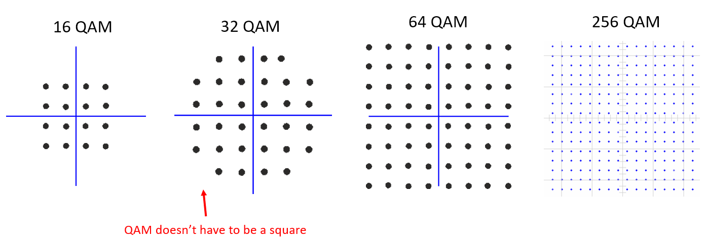 What if we combine ASK and PSK? We call this modulation scheme Quadrature Amplitude Modulation (QAM). QAM usually looks something like this: