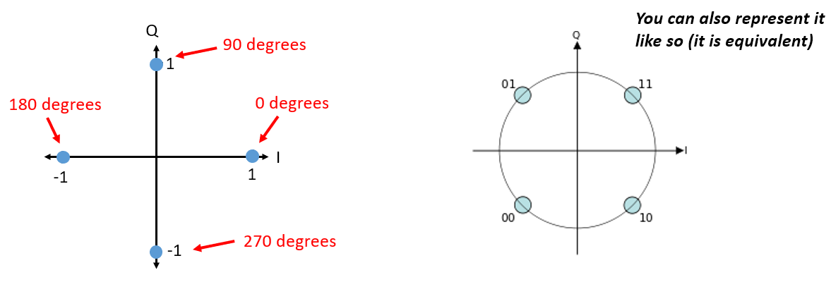 Back to PSK. What if we want four different levels of phase? I.e., 0, 90, 180, and 270 degrees. In this case it would be represented like so on the IQ plot, and it forms a modulation scheme we call Quadrature Phase Shift Keying (QPSK):