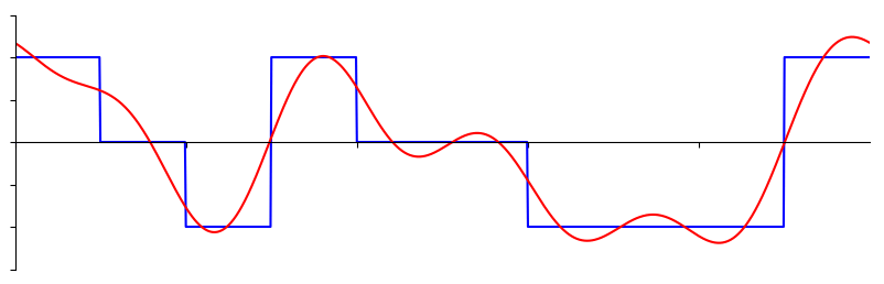Some signals require more sine waves than others, and some require an infinite amount, although they can always be approximated with a limited number. Here is another example of a signal being broken down into a series of sine waves: