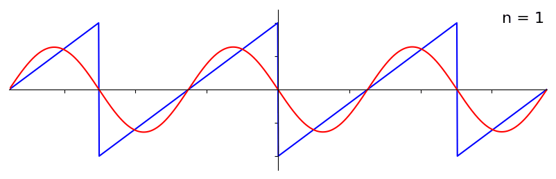 Here is another example; the red curve in the below approximates a sawtooth wave by summing up to 10 sine waves. We can see that itâs not a perfect reconstructionâit would take an infinite number of sine waves to reproduce this sawtooth wave due to the sharp transitions: