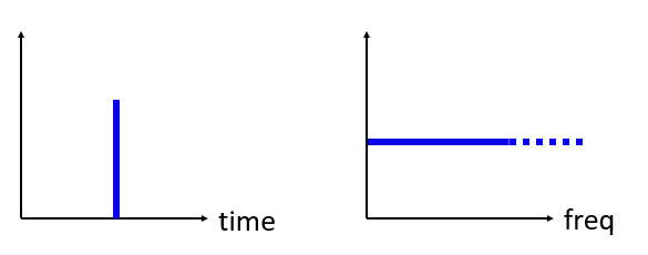 Now what if we had an impulse in the time domain? Imagine a sound recording of someone clapping their hands or hitting a nail with a hammer. This time-frequency pair is a little less intuitive.