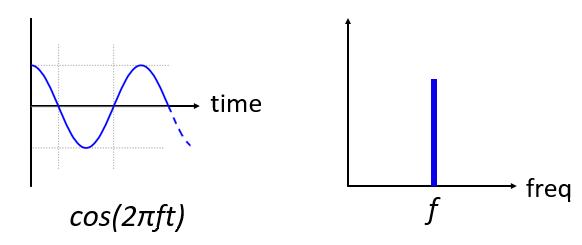 Here is what a sine wave, with frequency f, looks like in the time and frequency domain: