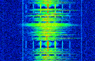 Because a spectrogram involves plotting 2D data, itâs effectively a 3D plot, so we have to use a colormap to represent the FFT magnitudes, which are the âvaluesâ we want to plot. Here is an example of a spectrogram, with frequency on the horizontal/x-axis and time on the vertical/y-axis. Blue represents the lowest energy and red is the highest. We can see that there is a strong spike at DC (0 Hz) in the center with a varying signal around it. Blue represents our noise floor.
