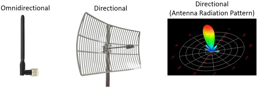 Gains will be depicted in dB (unit-less); feel free to learn or remind yourself why dB is unit-less for our scenario in the Noise and Random Variables chapter. Typically, antennas are either omnidirectional, meaning their power radiates in all directions, or directional, meaning their power radiates in a specific direction. If they are omnidirectional their gain will be 0 dB to 3 dB. A directional antenna will have a higher gain, usually 5 dB or higher, and anywhere up to 60 dB or so.