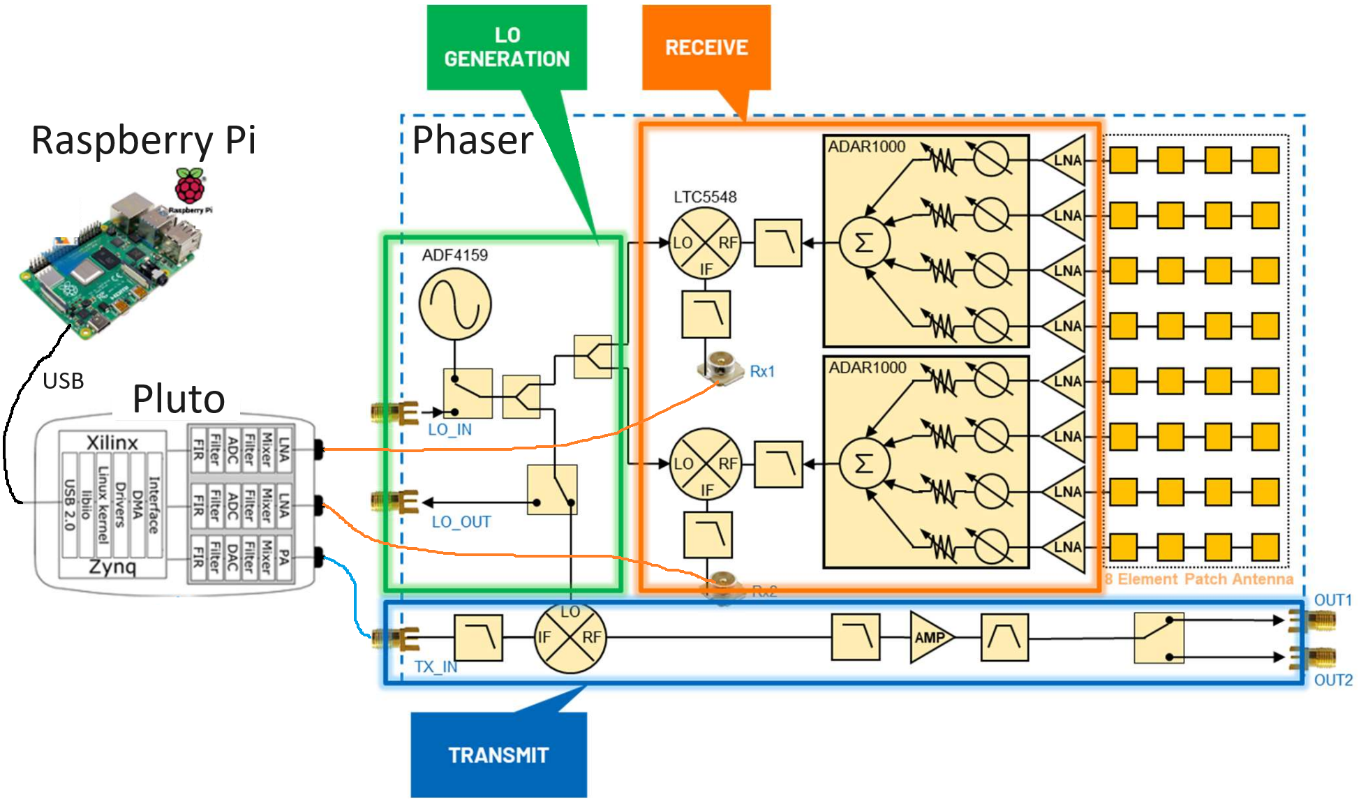The Phaser is a single board containing the phased array and a bunch of other components, with a Raspberry Pi plugged in on one side and a Pluto mounted to the other side. The high-level block diagram is shown below. Some items to note: