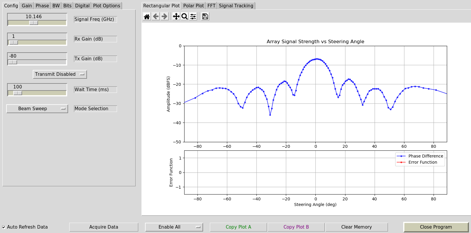 If you check the âAuto Refresh Dataâ checkbox in the bottom-left it should begin running. You should see something similar to the following when holding the HB100 in the Phaserâs boresight.