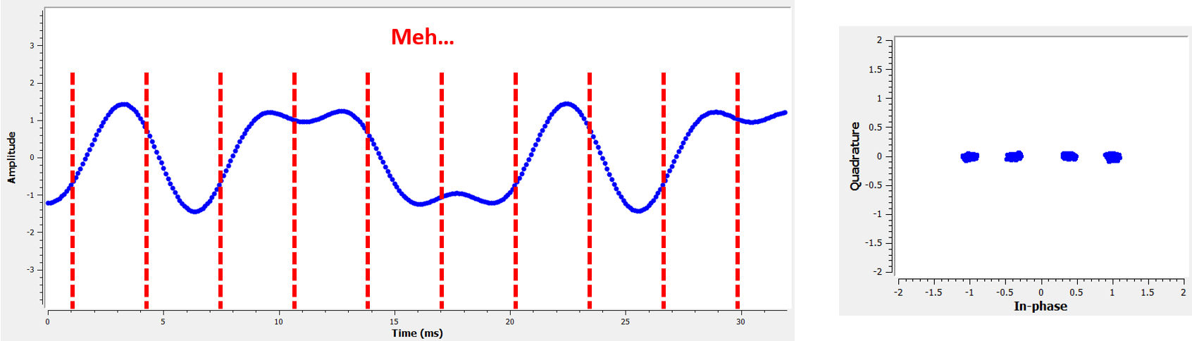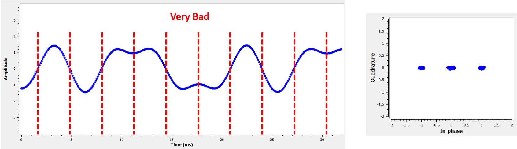 Here is another example of a poor sample time, somewhere in between our ideal and worst cases. Heed the four clusters. With a high SNR we might be able to get away with this sampling time interval, though it isnât advisable.
