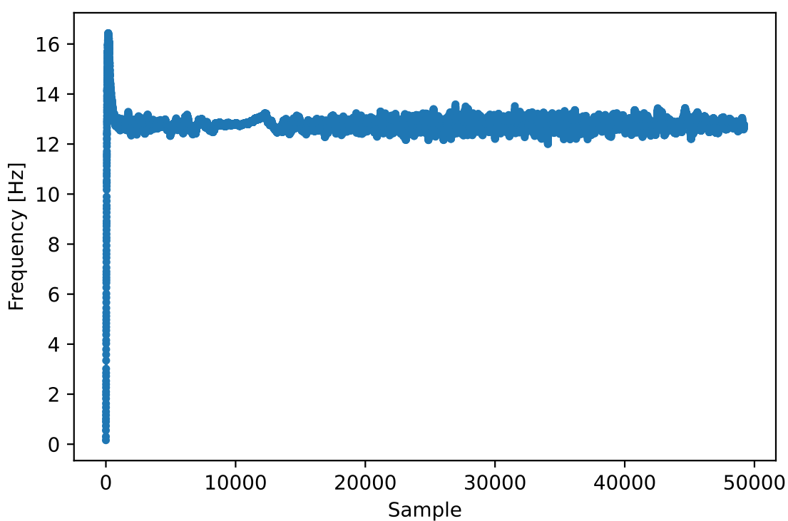 What this single line of Python is doing, is first calculating the product of our signal with a delayed and conjugated version of our signal. Next, it finds the phase of each sample in that result, which is the moment at which it goes from complex to real. To prove to ourselves that this gives us the information contained in the frequency variations, consider a tone at frequency \(f\) with some arbitrary phase \(\phi\), which we can represent as \(e^{j2 \pi (f t + \phi)}\). When dealing in discrete time, which uses an integer \(n\) instead of \(t\), this becomes \(e^{j2 \pi (f n + \phi)}\). The conjugated and delayed version is \(e^{-j2 \pi (f (n-1) + \phi)}\). Multiplying these two together leads to \(e^{j2 \pi f}\), which is great because \(\phi\) is gone, and when we calculate the phase of that expression we are left with just \(f\).